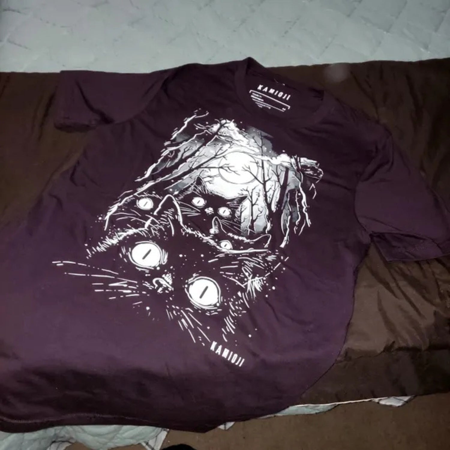 Love these cats. I got the ox blood color. Nice deep red hue to go with the beautiful art work. It was a hard choice cause all the colors were of a significant mood. High quality print. I think it's great. I might consider sewing my shirt on the back of a jacket. :^ )